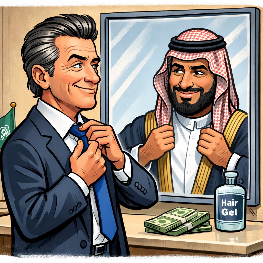 Watching Gavin Newsom at Davos in January, I couldn’t shake the feeling I’d seen this act before. The charm, the confidence, the sweeping vision for the future. Then it hit me: he’s MBS.
